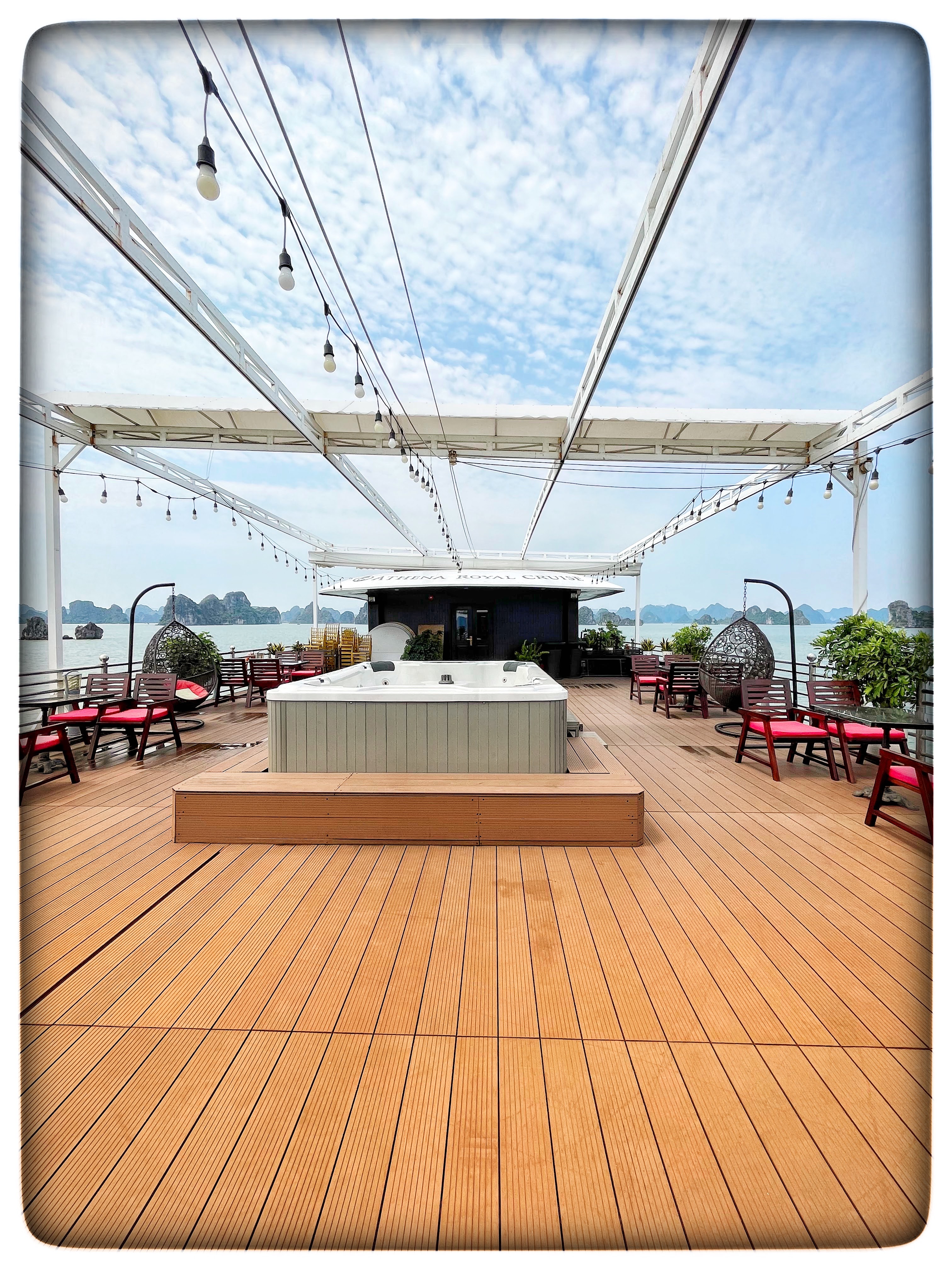 We then proceeded to check out our rooms and explore the rest of the yacht. The rooms were super pretty with a black and gold theme going on. We had a little balcony attached to the room overlooking the waters. The ship had 3 floors, the lowest one had around 10 rooms, the next floor had 5 rooms, and the dining hall and the top floor was the deck with a bar and hot tub which was not working when we were there. You could relax and read a book here while soaking in the views of the bay. Overall the boat didn’t feel like it was packed, in fact, everybody had their own space. We never felt like we were on top of each other but it was also compact enough to easily talk to people and make new friends. We actually befriended a nice couple from Malaysia.