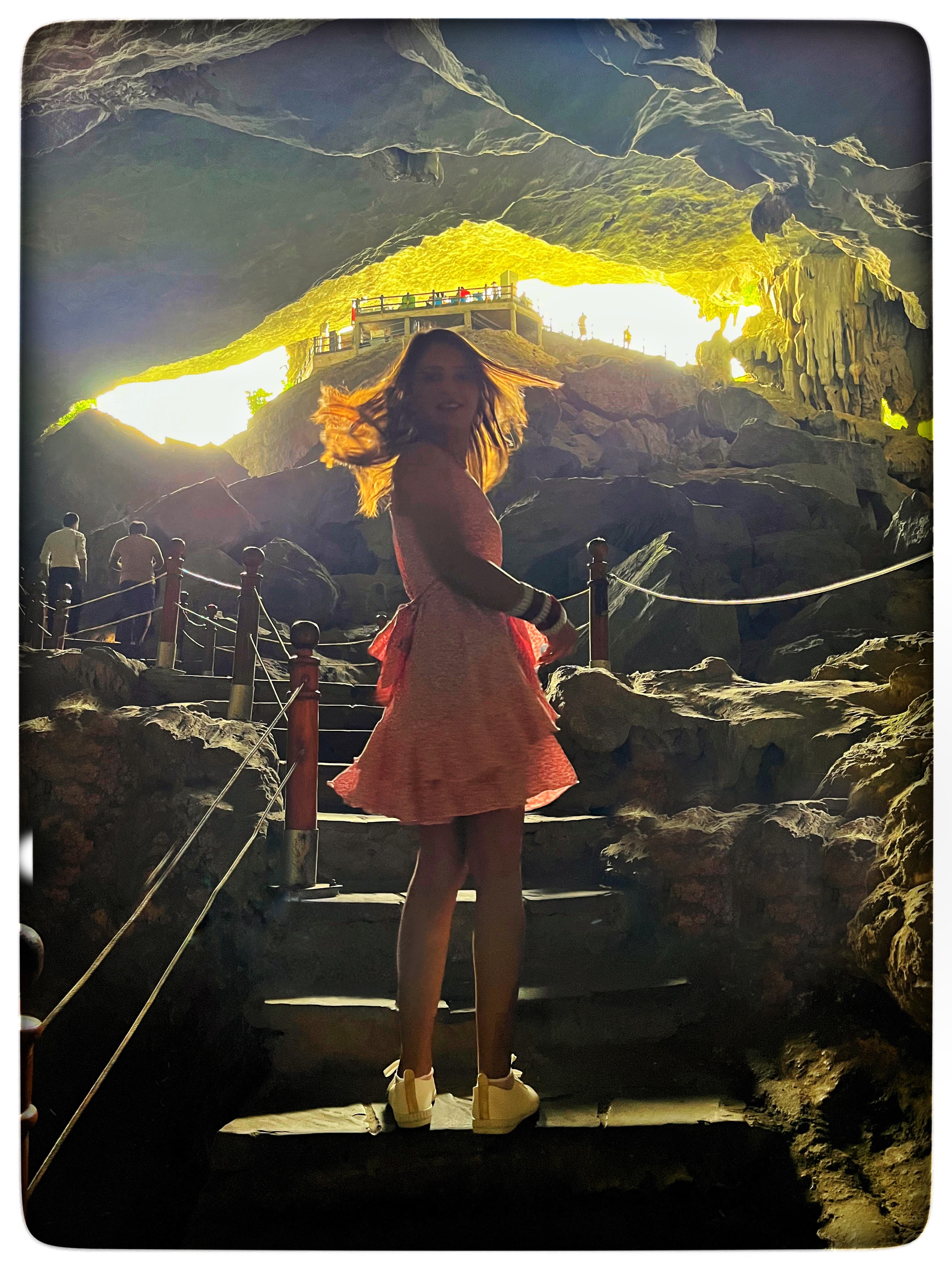 We relaxed for a bit on the deck and then proceeded to get ready for the sightseeing. We disembarked the ship, got on a boat, and started for our first stop which was Sung Sot Cave also known as “Surprising Cave” or “Amazing Cave”. The cave is known for its impressive rock formations and large chambers. The cave is believed to have formed around 500 million years ago. The boat dropped us at the entrance and the view from there was spectacular. We had to climb around 700-900 steps to reach the cave entrance. The pathway to the entrance is very beautiful and green. The cave itself is divided into three chambers which are lit by different colored lights. There are beautiful rock formations inside. It felt like we were in a large museum. We covered the whole cave and exited at another point where our boat was waiting for us to take us to our next destination i.e. Ti Top Island.